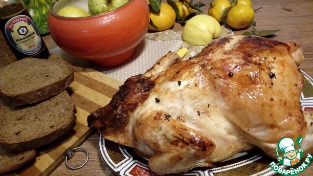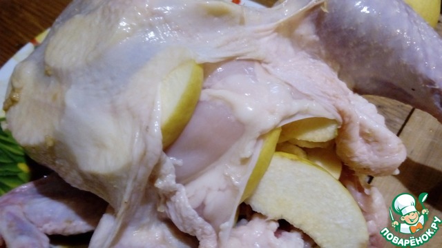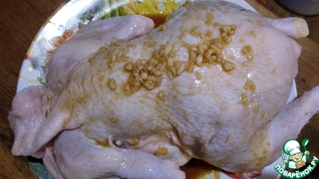 Курицу снаружи и внутри обмазать смесью соевого соуса, чеснока, лимонного сока. Оставить на полчаса.