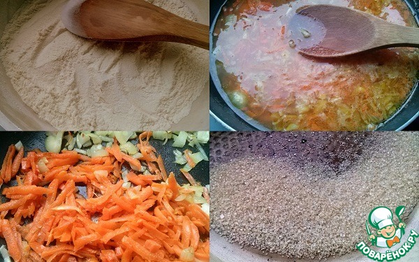• Для красного соуса: муку обжарьте на сухой сковороде до желтого цвета. Она придаст соусу ореховый привкус. Разведите муку стаканом говяжьего бульона и тщательно перемешайте до однородности. В оставшийся бульон добавьте обжаренные мелко нашинкованные коренья (лук, морковь, корень петрушки), томатный сок и доведите до кипения. Сахар высыпьте на сухую сковороду и прогрейте на медленном огне до коричневого цвета.