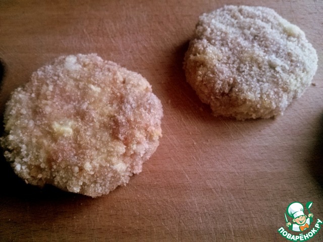 • Сформируйте круглые эскалопы, обваляйте в панировочных сухарях. Панировочные сухари обязательно просейте через сито, так панировка будет ложится ровнее. Эскалопы обжарьте на разогретом масле с обеих сторон до румяности.