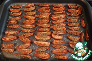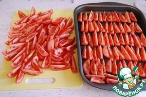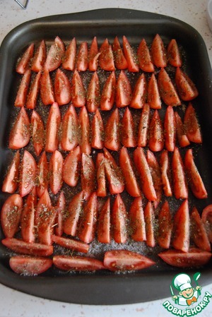 Помыть, порезать помидоры вдоль на 6 частей. Разложить на противень. Можно положить на пергамент.