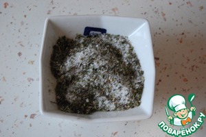 Смешать соль, сахар и смесь прованских трав. У меня это розмарин, базилик, тимьян, укроп, майоран. Три чайные ложки, столько же соли, четыре ложки сахара. Указанного количества хватит на два подноса.