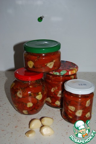 В баночку налить пару столовых ложек оливкового масла. Сложить туда помидоры, перекладывая каждый слой, нарезанным поперёк чесноком. Каждый слой немного придавливать. Если нужно, масла можно немного добавить.