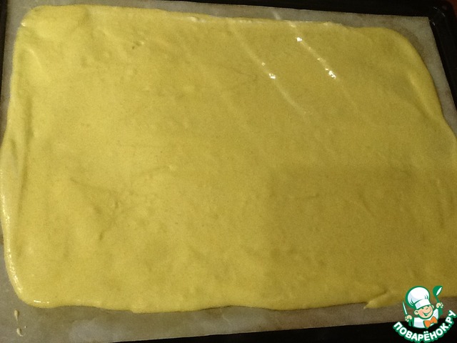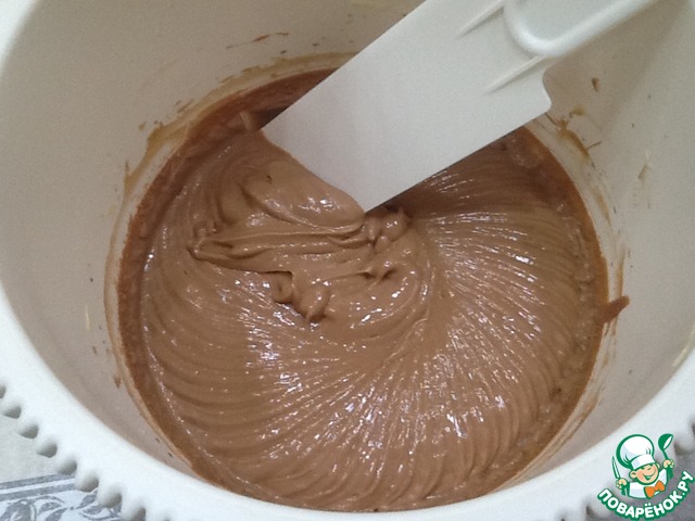 Вот такое воздушное тесто получается. Выкладываем его на противень и печем так же, как и белый корж - на 200 градусах до сухой зубочистки. Я пекла 10 минут.