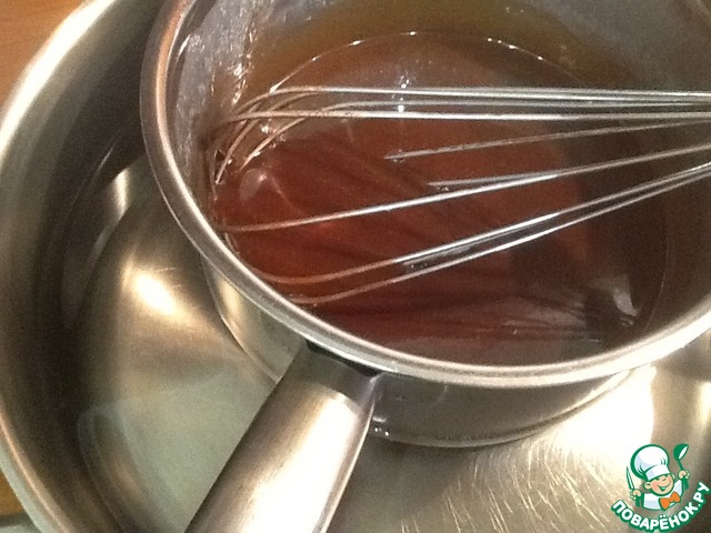 Варим шоколадно-карамельный крем! Тут я забыла сфотографировать пару шагов - опишу словами. Сначала варим карамель: воду, сахар и мед кладем в небольшой сотейник или кастрюльку, ставим на огонь и, не мешая!!!, даем закипеть. Кипит минут 6-8 до янтарного цвета. В это время греем почти до кипения сливки (я нагрела в микроволновке). Когда карамель станет красивого янтарного цвета, надо аккуратно влить в нее сливки и быстро размешать венчиком. Будьте осторожны - очень брызгается!