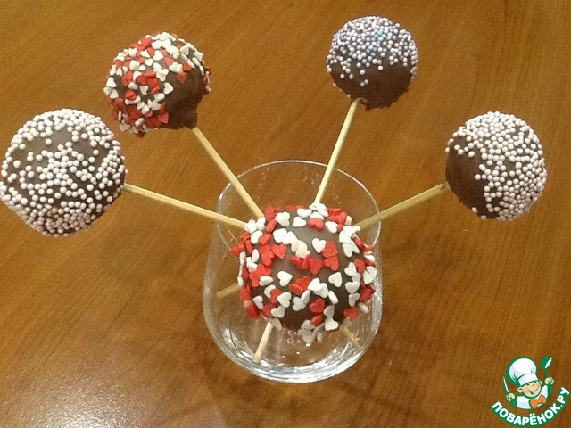 Остатки коржей я раскрошила, добавила в них крем до пластичности, в серединку воткнула мармеладку и налепила вот таких кейк-попсов. Облила шоколадом, посыпала украшениями и остудила в холодильнике. Получилось 21 штука. В кафе уехали 16, эти 5 остались дома (не поместились в контейнер) и дожили тоже до фотосессии :) остальные дети слопали так быстро, что взрослые их даже не заметили.