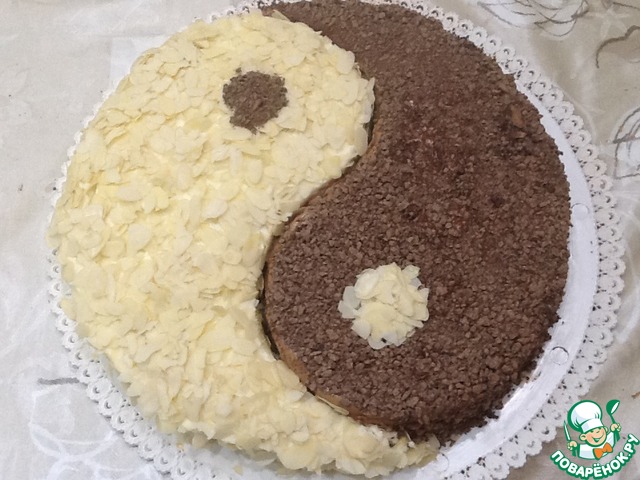 Так получилось, что мы с моим мужем родились в один день. Поэтому, когда я искала, какой же торт испечь на наш общий праздник, увидела такой тортик у Нины Тарасовой и загорелась им. Но он не совсем нам подходил - у нее белый корж кокосовый, а я категорически не люблю кокос, поэтому утащила у нее по сути только идею оформления и крем у шоколадного коржа, остальное - мое творчество. Поэтому могу смело сказать, что торт мой авторский. Итак, женское земное начало - шоколадно-кофейный корж и шоколадно-карамельный крем; мужское небесное начало - белый бисквит Джоконда с миндальной мукой и крем сливки с рикоттой. Звучит заманчиво! Правда придется повозиться, но он того стоит! Приступим?