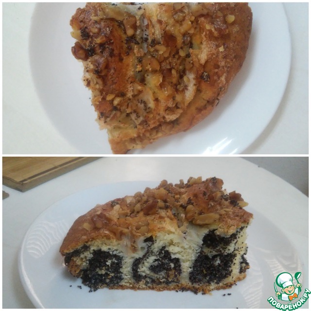 Мои впечатления: Прежде всего хочу сказать, что пирог ооочень красив и сверху и в разрезе. Вкус у него тоже замечательный, но в начинке и в тесте вкуса творога не чувствуется, так что этот пирог для больших любителей мака.