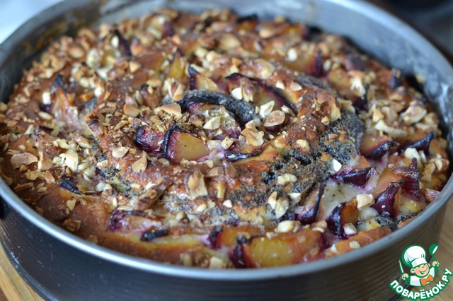 [+2]Мои изменения: слив у меня не было, но отказать себе в такой красоте я не смогла и вместо слив использовала яблоки. К маку орехи не добавляла, а добавила изюм ( мне очень нравится сочетание мака и изюма ), а орехами украсила верх пирога.