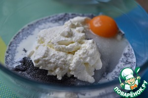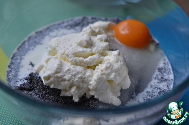 В миске смешать мак с сахаром, добавить творог, молоко и желток.