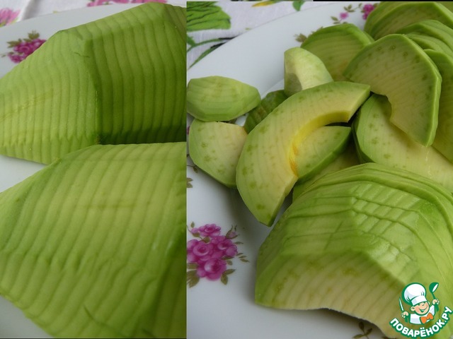 Авокадо очистить и нарезать пластинами, сбрызгуть соком лимона.