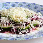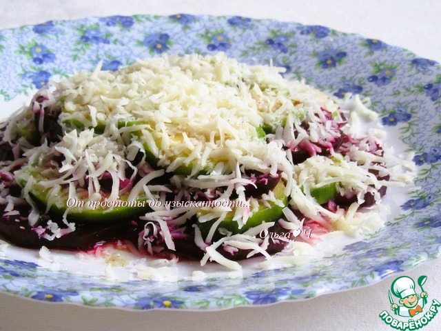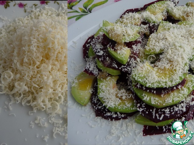 На сервировочную тарелку выложить вперемешку пластинки свеклы и авокадо. У меня получилась горка, можно выложить в один ряд.