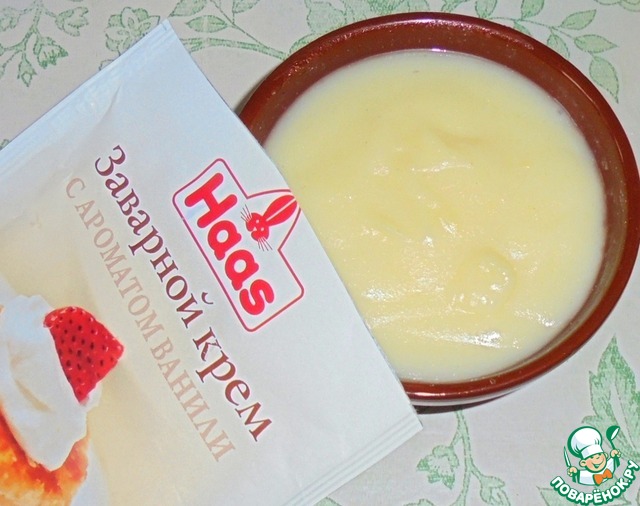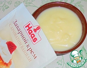 Нагреваем 150 мл молока и выливаем смесь. Проварить до густоты. Остудить заварной крем. Он получается с ароматом ванили.