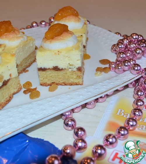 На пироге наметить надрезы для кусочков, 2 белка взбить с сахарной пудрой до крепких пиков ( у меня что то пошло не так, извиняюсь), выложить массу в кондитерский мешок с фигурной насадкой и отсадить на каждый будущий кусок. Подсушить меренги в духовке, при 150 градусах, 7 - 10 минут.