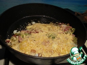 После обжарки до полуготовности яиц, засыпаем сыром и сверху обжаренным кунжутом.