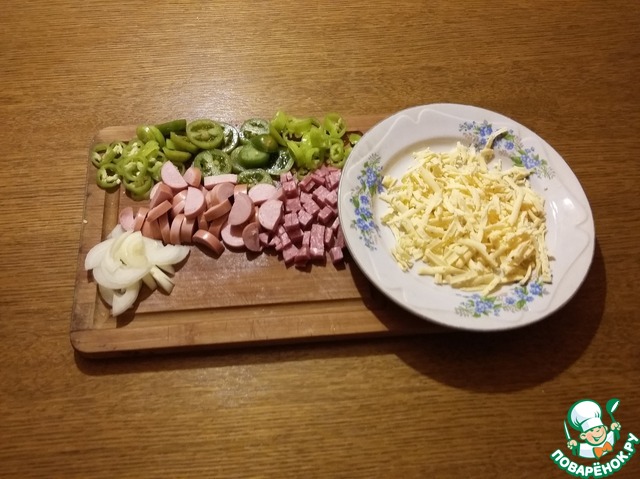 Нарезаем помидоры и перчик колечками. Сосиску полукольцами, колбасу кубиками, лук полукольцами. Сыр натираем на крупной терке.