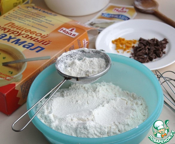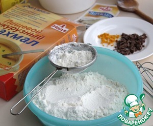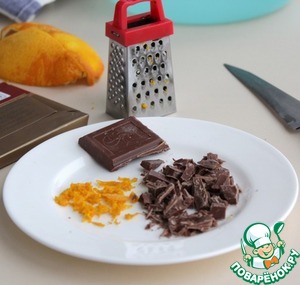 Просеять муку с крахмалом, содой, хорошо перемешать венчиком, добавить натертую цедру и нарубленный шоколад, снова перемешать.