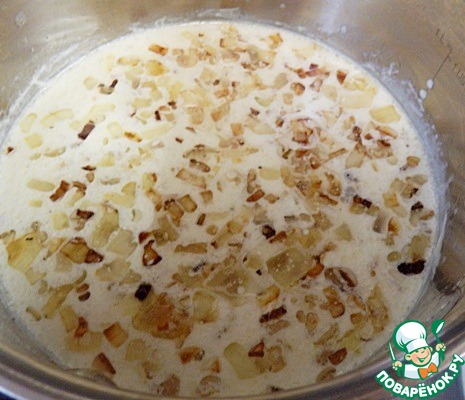 В кастрюльке соединяем сливки с луком и ставим на огонь. Помешивая, подогреваем. Но не кипятим.