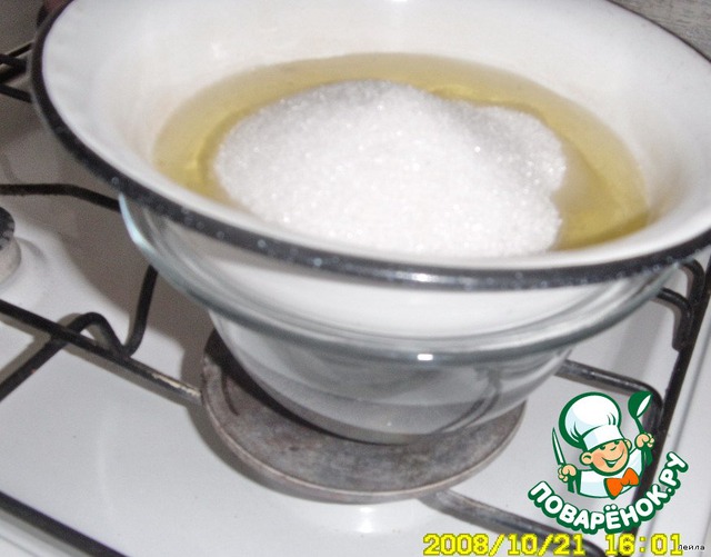 соприкасалась с металлической чашей, только пар). Нагреваем массу на маленьком огне не более чем до 60 градусов, время от времени перемешивая. Сахар должен раствориться полностью. Это проверяется так : двумя чистыми (сухими) пальцами протирается смесь и чувствуется отсутствие крупинок сахара. -
