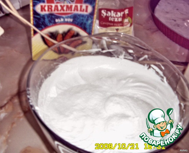 1 ст. л. сахарной пудры пополам с кукурузым крахмалом смешать вместе и просеять во взбитую смесь.