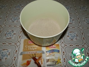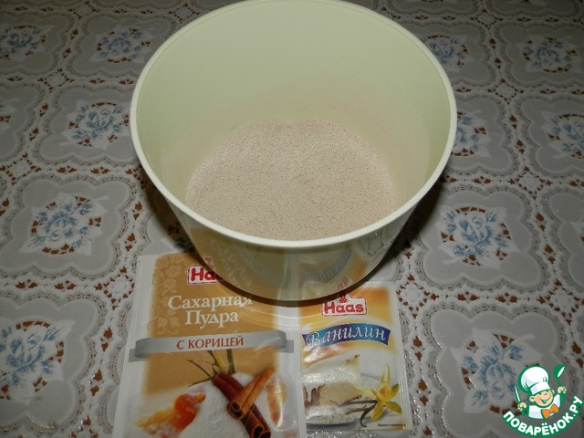В глубокой чаше смешать сахар, сахарную пудру с корицей и ванилином. Вместо сахарной пудры с корицей можно взять классическую сахарную пудру Haas.