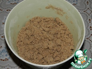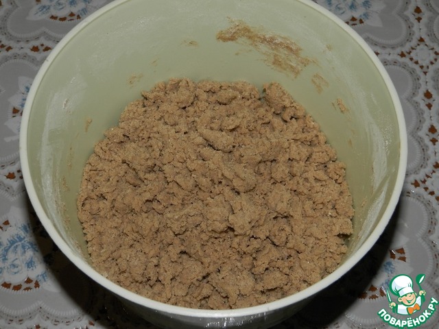 Всыпать просеянную муку с разрыхлителем. Хорошо размять руками. Получатся мягкие крупные кусочки. -