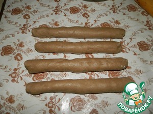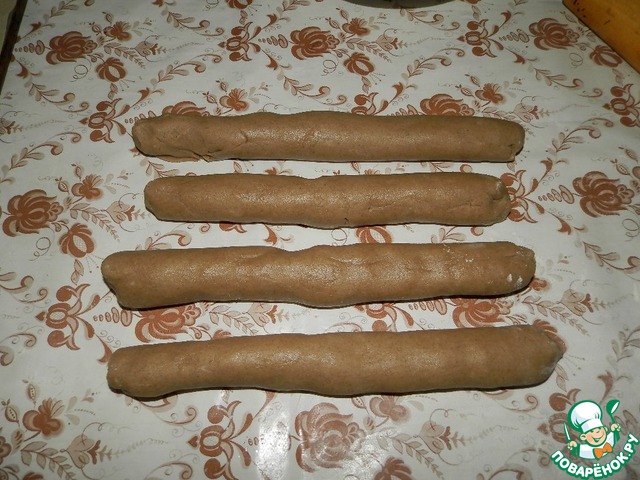 Сформировать из приготовленного теста 4 колбаски диаметром 2-3 см. Завернуть в пищевую плёнку и положить в холодильник минут на 40.