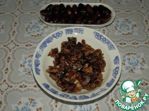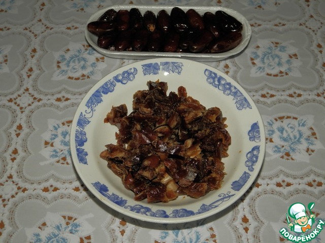 Пока тесто охлаждается, подготовим начинку. Финики освободить от косточек, порезать маленькими кусочками, промыть холодной водой и отжать.