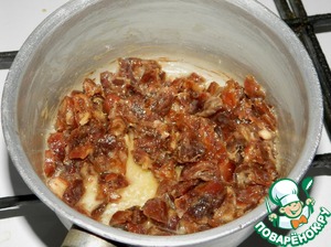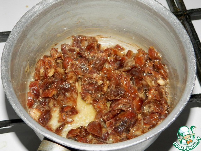 В небольшом сотейнике растопить 60 грамм сливочного масла, положить туда финики и нагревать до тех пор, пока финики не впитают всё масло и размякнут. Начинку остудить и разделить на 4 части.