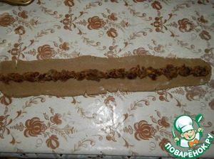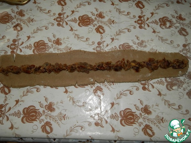 Вынуть из холодильника тесто на присыпанный мукой стол, каждую колбаску раскатать в полоску, шириной 5 см. Во всю длину разложить финиковую начинку.