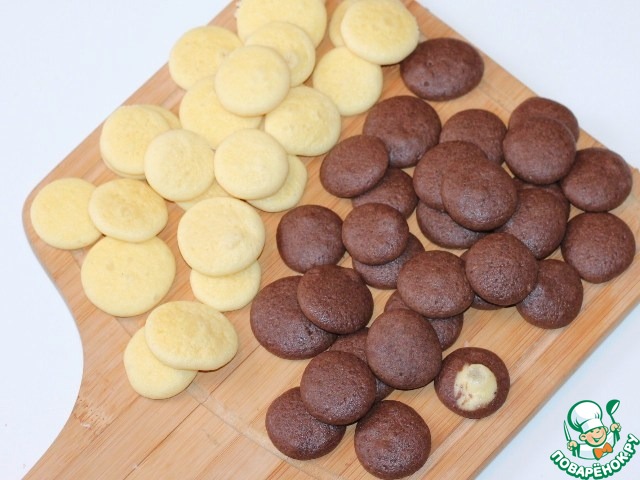 12. Половину готовых бисквитиков смазываем взбитыми сливками, затем накрываем другой половиной бисквитов.