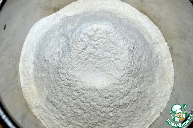 Муку вместе с сахаром, солью и разрыхлителем просеять в миску.