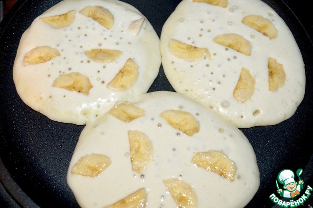 Разогреть сковороду, по желанию смазать ее маслом. Тесто выливаем на сковороду и выкладываем бананы.