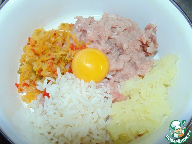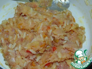 Маленький кусочек кабачка натереть на мелкой терке и отправить к фаршу. Добавить отварной рис, овощи и желток. Чуть-чуть посолить.