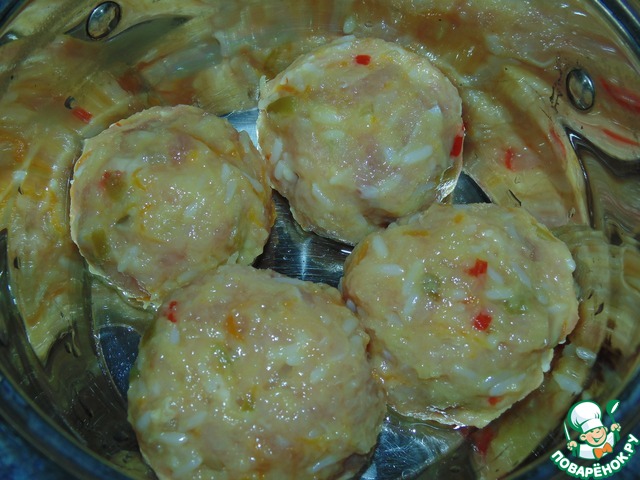 Сырыми руками слепить тефтельки. Выложить в смазанную растительным маслом кастрюлю с толстым дном. Налить примерно 100 мл. воды. Тушить на медленном огне, примерно 30-35 минут. Подавать со свежими овощами.