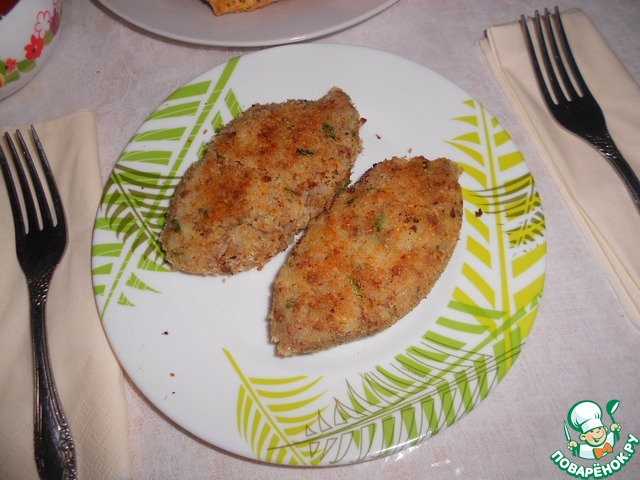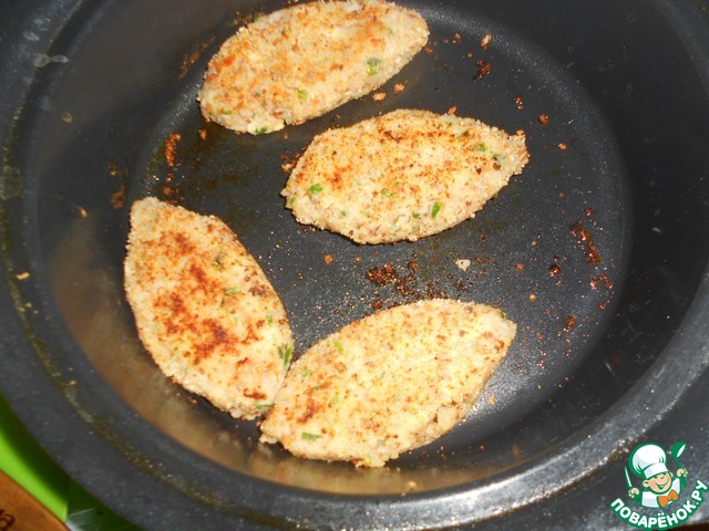 • Обвалять полученные котлеты в панировочных сухарях, пожарить до румяности с обеих сторон на растительном масле.