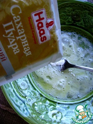 Третье яйцо взбить вилкой со щепоткой сахарной пудры в пену.