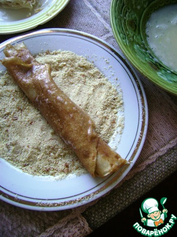 Класть пару ложек тертых яблок на блинчики, сворачивать трубочкой, обмакивать во взбитое яйцо и панировать в сухарях.