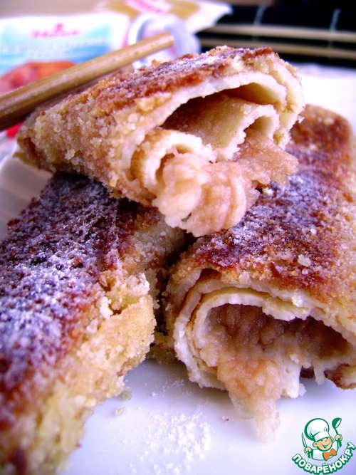 Такие блинчики с фруктами - один из самых любимых завтраков русских туристов в маньчжурских кафе. Хрустящие снаружи, с сочной начинкой внутри, они просто великолепны. Кроме яблок, очень популярны блинчики с бананами и ананасами. Калорийно, конечно, но изредка можно побаловать семью.