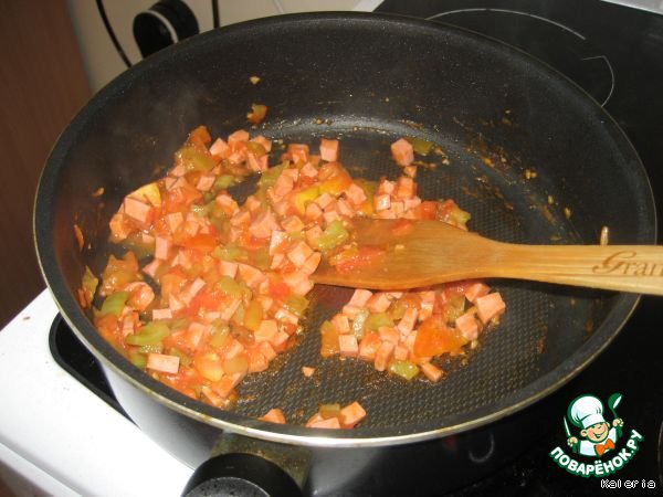 Режем и обжариваем на подсолнечном или оливковом масле лук, помидоры, колбасу и перец (я еще домашнее лечо добавляла).
