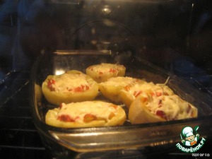 Чистим картофель, разрезаем пополам, внимаем серединки и укладываем на противень. В каждую получившуюся "чашечку" кладем кусочек сливочного масла или смазываем майонезом. Затем выкладываем начинку.