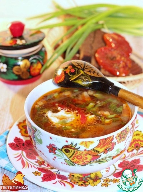 10. За 5 минут до окончания варки щей, добавляем в кастрюлю соль, перец горошком и лавровый лист. После того как сварятся щи, они должны немного настояться под крышкой, затем удаляем лавровый лист. Подаем щи со сметаной, зеленым луком с кусочками черного хлеба. А у меня еще вяленые помидорчики, вкусно!