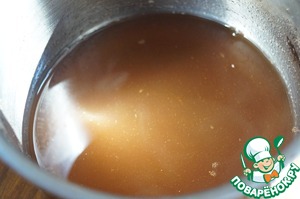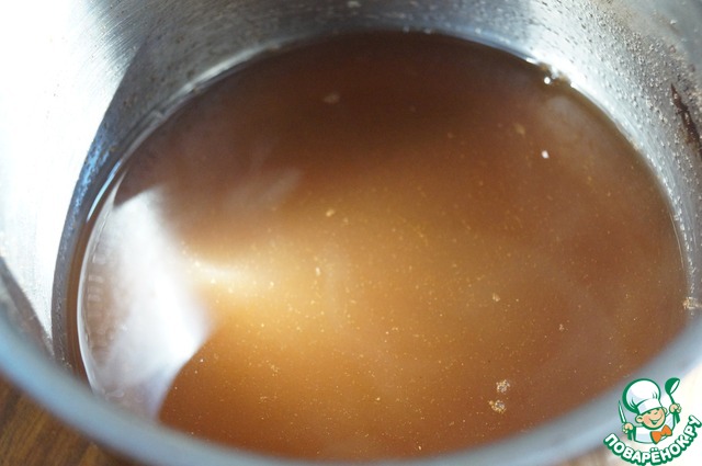 Сварим сироп. Воду смешаем с сахаром и доведем до кипения, затем огонь убавим и будем помешивая варить 10 минут. Снимем сироп с огня, добавим 2 столовые ложки меда, 0.5 ч. л корицы ТМ Haas, и чайную ложку сока имбиря. Все перемешаем и дадим остыть.