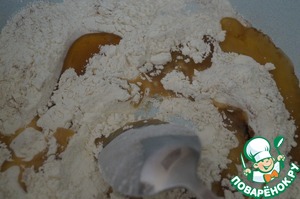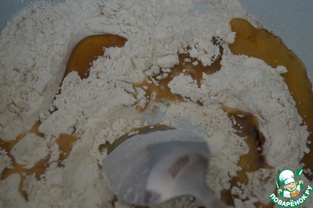 Добавить мед с имбирем и рисовым вином, замесить тесто.