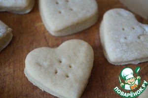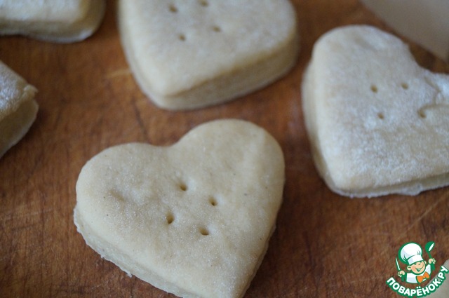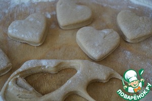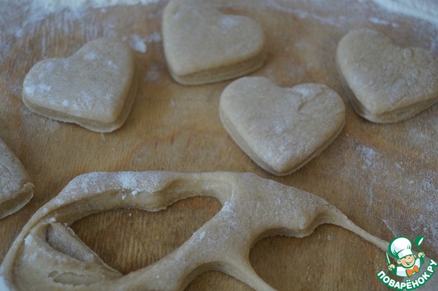 Тесто раскатать в тонкий пласт, сложить его пополам и еще раз пополам. Получается 4 слоя, толщина должна быть около 1,5 см. Выемкой вырезаем печенье. Обычно его делают в форме цветочка, но у меня нет такой выемки, поэтому я сделала в форме сердечка.