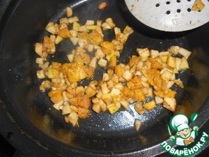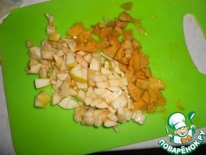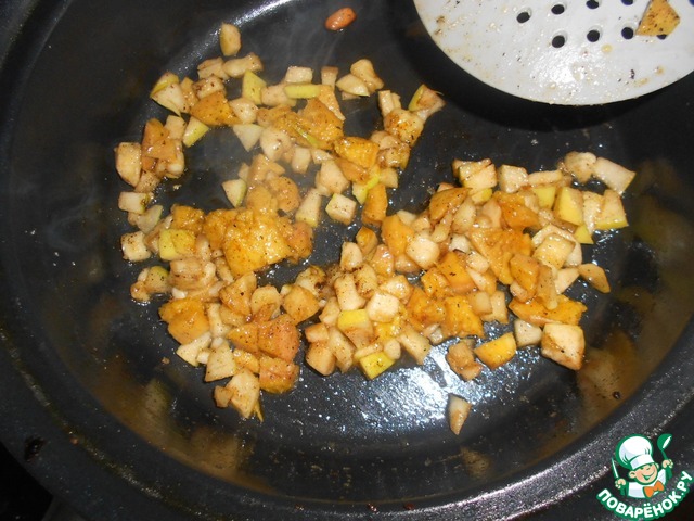 Туда же положите нарезанные фрукты, посыпьте 1,5 ч. л. тростникового сахара и обжаривайте в течении 2-3 минут.