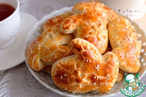 Слоеное тесто раскатать в пласт толщиной 0,2 - 0,3 см. Формочками для печенья вырезать заготовки-рукавички.
