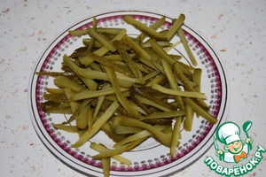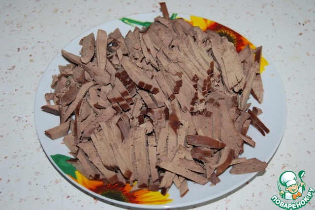 К этому времени печень уже готова. Сливаем, промываем, даём остыть. Далее нарезаем тонкими полосками.