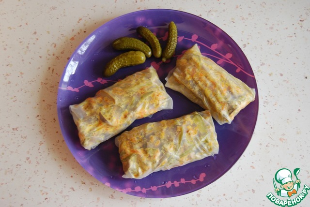 Подготавливаем большую тарелку с тёплой водой и чистое кухонное полотенце. Опускаем лист рисовой бумаги в воду на 10 секунд, после выкладываем на полотенце на несколько секунд с двух сторон, даём воде стечь. Кладем на тарелку, выкладываем начинку и заворачиваем конвертиком
