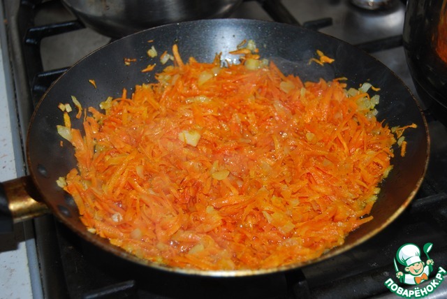 Лук мелко нарезаем, морковь трём на крупной тёрке. Пассеруем лук с морковкой. В сковородку сначала кладём лук, даём ему подрумяниться, затем добавляем морковь.