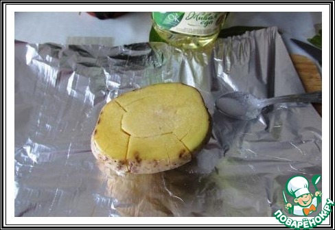 Укладываем на лист фольги. Поливаем растительным маслом и присыпаем солью, растирая по поверхности.